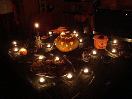 Gosto de festas. Sempre fui assim! Qualquer motivo para festa, eu estou lá! Por isso, adoro o Halloween! Dá-me tanto gozo preparar os fatos, a decoração, vibro! Mas há 3 anos a coisa tomou outras proporções...fomos a uma loja com coisas para festa e achámos piada a uns castiçais, umas decorações...daí a termos um verdadeiro arsenal de material de halloween foi um pulinho! Portanto, o ano passado, o aspecto da nossa mesa era este:
