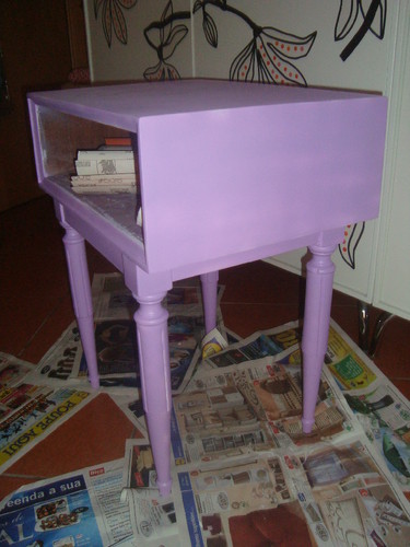 Começámos as pinturas (em spray!! Fica muito melhor!), em lilás, já que o meu quarto tem cinzentos, lilázes, preto e branco. Ainda demos uma demãos valentes, perdi-lhes a conta porque à pala da chuva não consegui fazer tudo de seguida. Os puxadores, como achei bonitos, foram apenas pintados!