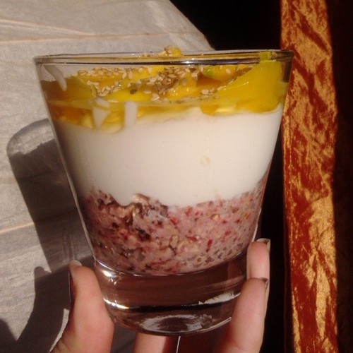 Esta cup que fiz tem como base aveia integral, umas quantas avelãs, sementes de linhaça e morangos. Tudo moído no processador de alimentos ou no liquidificador. A meio tem iogurte grego natural magro e em cima um fio de mel, manga aos pedaços e sementes de sésamo. Se não forem lá pelo aspeto (o que eu acho, particularmente difícil), vão por mim quando vos digo que são maravilhosas e saciantes! Dão um pequeno almoço espetacular, lanche ou mesmo almoço de fds no nosso caso cá em casa, que pode não se acordar muito cedo e com vontade de cozinhar!
